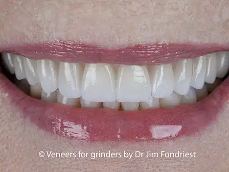 In the past, the first choice for grinders would be PFM crowns. The porcelain selected for these restorations was ultra hard. We have found that it is not advisable to use porcelain that is harder than enamel. The PFM’s of the past had been made with super hard porcelain with bad outcomes. If the porcelain is too hard, it acts as an abrasive to the opposing teeth. The lower teeth will just wear down faster. When the porcelain has the same hardness, the veneers will passively wear at the same rate as the opposing teeth. Matching nature is better!